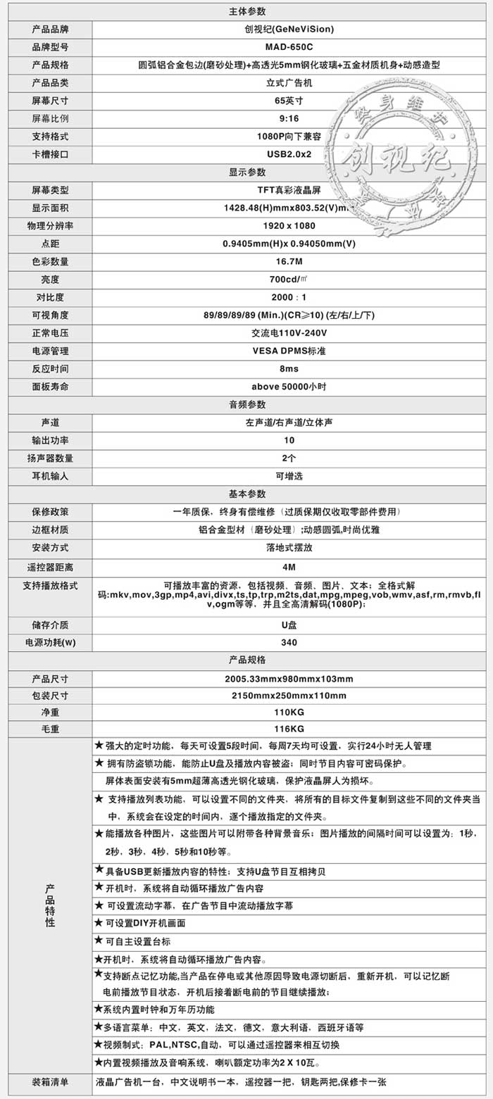液晶屏尺寸        65寸 TFT 液晶顯示屏