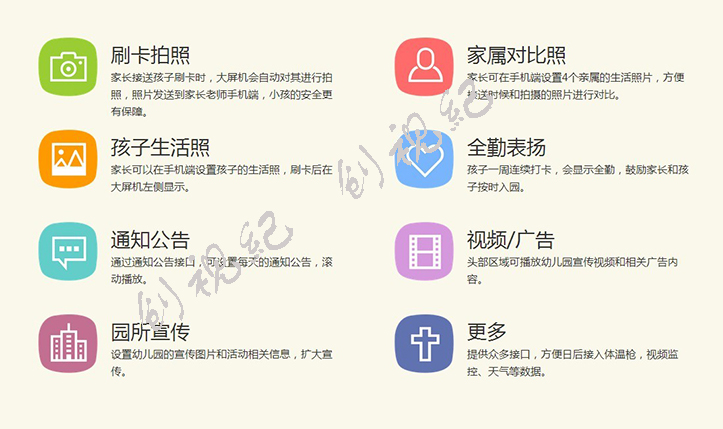 多智能硬件,滿足園方運營需求整合綁定幼兒園及滿足家長對安全、健康、互動的需求: