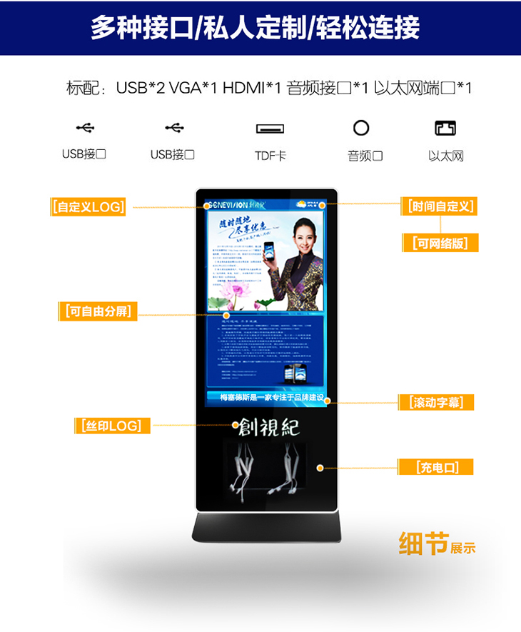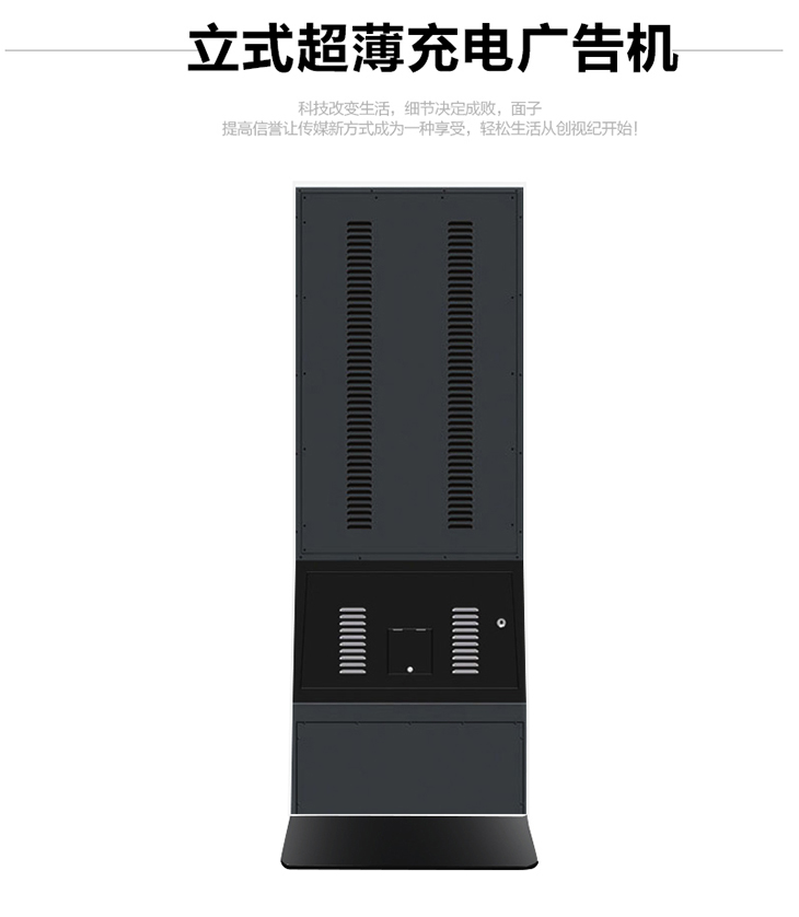 此款機型是一款以手機充電為核心功能,影音廣告播放系統(tǒng)為主,可兼容燈箱廣告的多功能廣告型手機充電站。標配12路充電接口設(shè)計可以滿足各類客戶的需求(多路可根據(jù)客戶需求),它已成為體育中心,機場,商場、會議中心、商業(yè)街、加油站的首選。